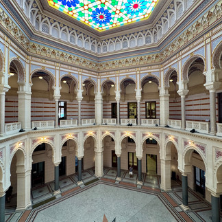 Und ja – dieses Gebäude ist eine Bombe. Im besten Sinne. Wir kommen kaum aus dem Staunen heraus: filigrane Ornamente, kunstvoll bemalte Decken, majestätische Bögen und eine Lichtstimmung, die fast schon magisch wirkt.