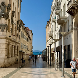 Split von seiner eleganten Seite. Diese Marmorstraße ist das Herz der Fußgängerzone – gesäumt von Modegeschäften, Eisdielen, Straßenkünstlern und Cafés.